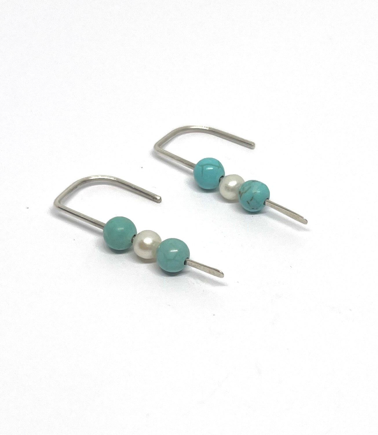 Ocean Tranquility: Silver Dangle Earrings with Freshwater Pearls and Turquoise