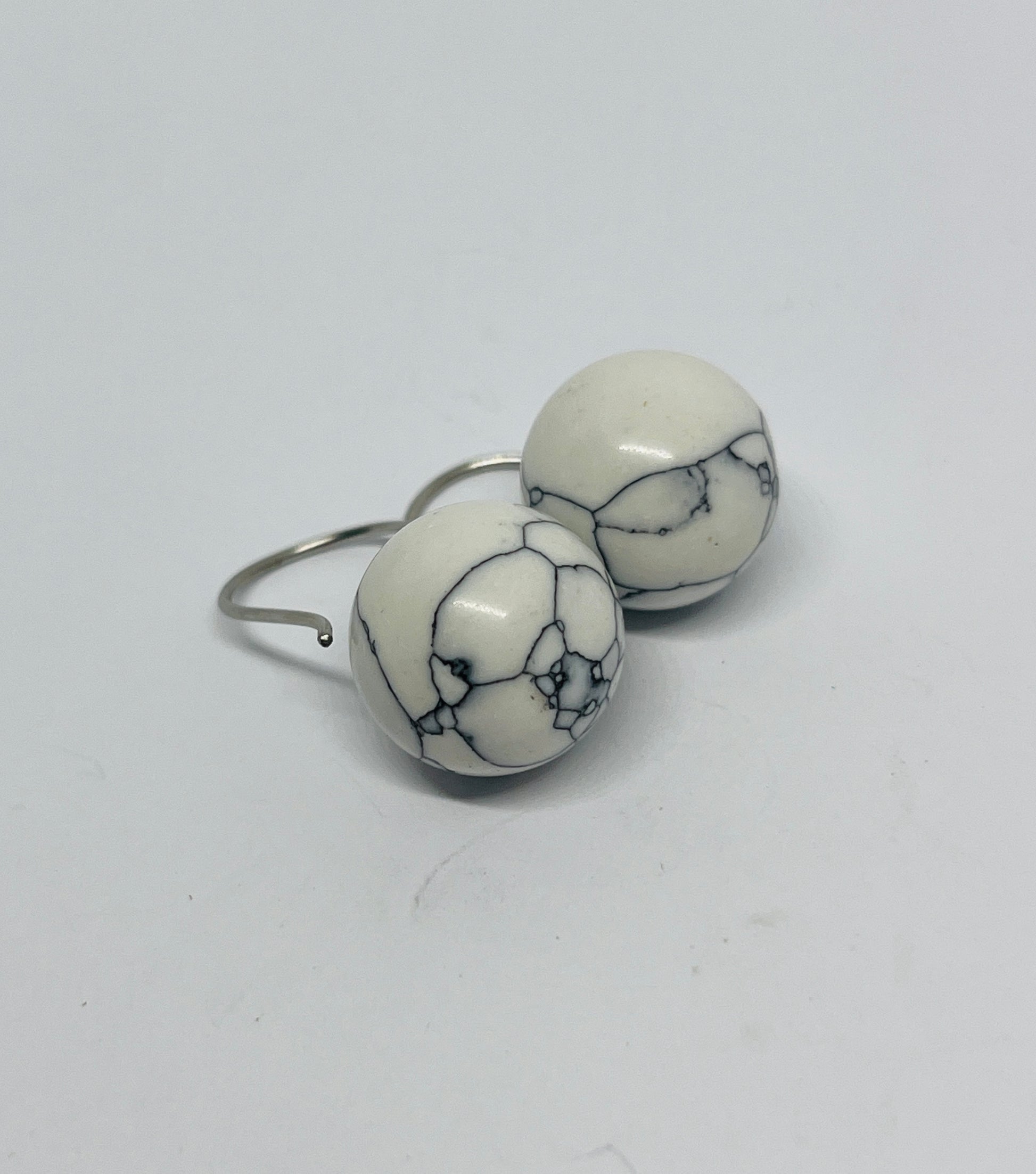 Graceful and grounded, these handcrafted hook earrings pair the soft marbling of howlite with the sleek simplicity of stainless steel. Suspended with gentle movement, the natural stone evokes cool earth and cloudy skies — serene, textural, and effortlessly refined.