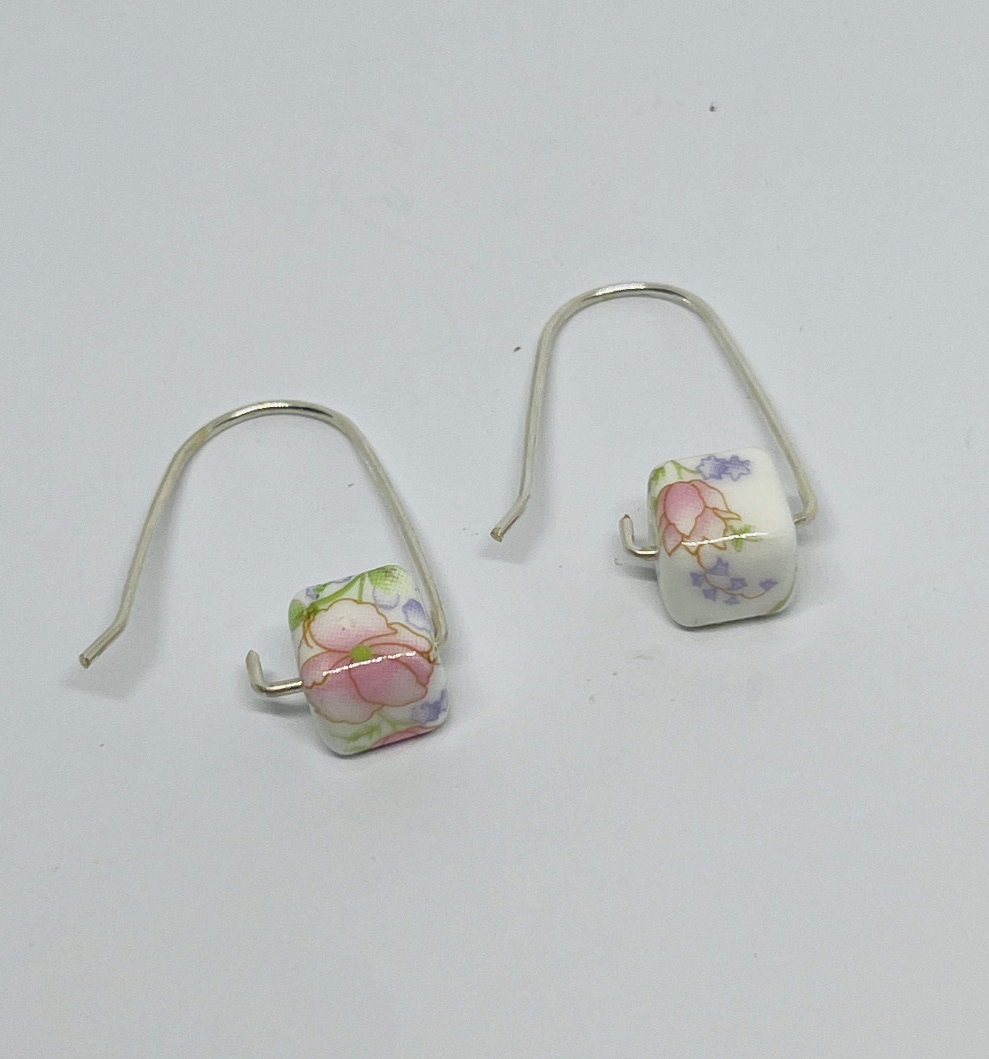 Inspired by the beauty of weathered porcelain, these earrings reflect the charm of forgotten treasures and the artistry found in nature’s reclamation. The juxtaposition of the delicate dinnerware fragments against the sleek silver hooks creates a striking balance, representing the resilience of beauty amid the passage of time and tide.