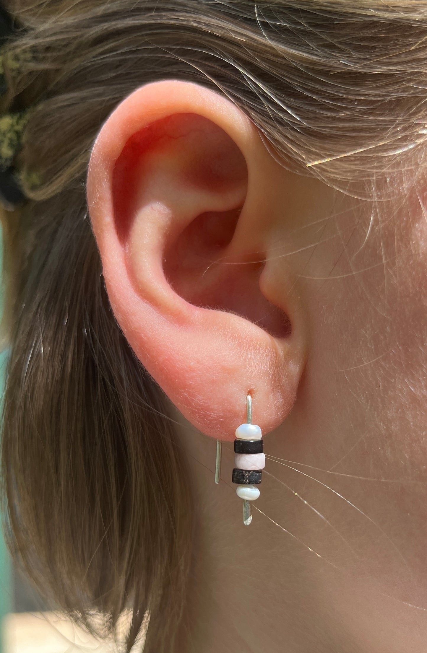 Waves of Harmony: Silver Dangle Earrings with Freshwater Pearls, Black Obsidian, and Rose Quartz